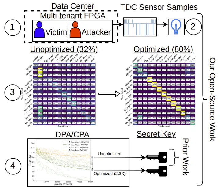 Turn on, Tune in, Listen Up Is an open-source framework for implementing voltage flucturation sensors in FPGA devices for use in side-channel security research. Side-channels are an ever present hardware security threat. The reconfigurability of FPGAs significantly broadens the side-channel attack surface in many cloud heterogeneous systems. We have developed a highly tunable side-channel sensor, which significantly improves side-channel attack time and resolution in multiple contexts. Concurrent users sharing the same device may attack one another through the power side-channel (check out our paper), while consecutive users may attack one another through measurement of the physical wear-out state of the FPGA device (check out our paper). We have demonstrated these attack surfaces on both Intel (Altera) and AMD (Xilinx) platforms. Currently, our open-sourced sensor design and side-channel analysis flow is limited to AMD devices. We are seeking CSE/CS/CE/ECE researchers interested in FPGA design, heterogeneous computing and/or hardware security to combine our Intel and AMD side-channel sensors into a unified attack framework and comparing capabilities between vendors.