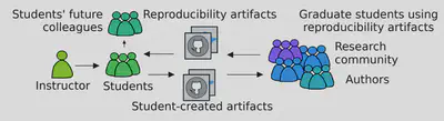 Secondly, as shown in the figure, involving students in reproducibility efforts can have a significant impact on the reproducibility ecosystem itself. Students can create reproducibility artifacts, such as replicable experiments or data analysis, that can be used by other researchers, including authors and graduate students. Additionally, students can consume reproducibility artifacts created by the research community, provide feedback, and suggest improvements. Authors appreciate this type of engagement, as it adds value to their work and promotes open science.