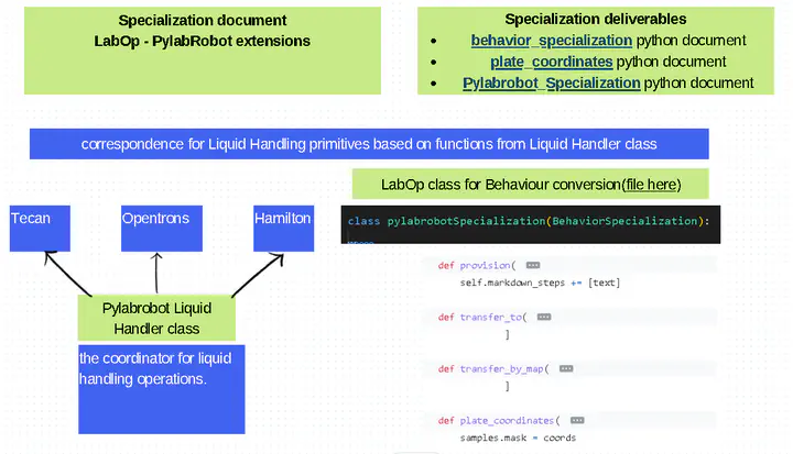 The second step is to create a file that’ll do execute the conversion. In this file I will define a Labware map that’s basically a dictionary translating the resources LabOp names into Labware IDs recognizable by PylabRobots “resource” classes and a Behaviourspecialization class that should convert LabOp actions into PylabRobots Liquid Handler class operations as they’ll coordinate the commands sent from the script to the machines.(see featured images)