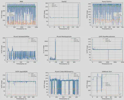 | Figure 2. CPU utilization pattern of 9 applications in DNA-Seq Alignment workflow collected by GenScale. y-axis: (num. cores) x 100%, x-axis: time elapsed in seconds. |